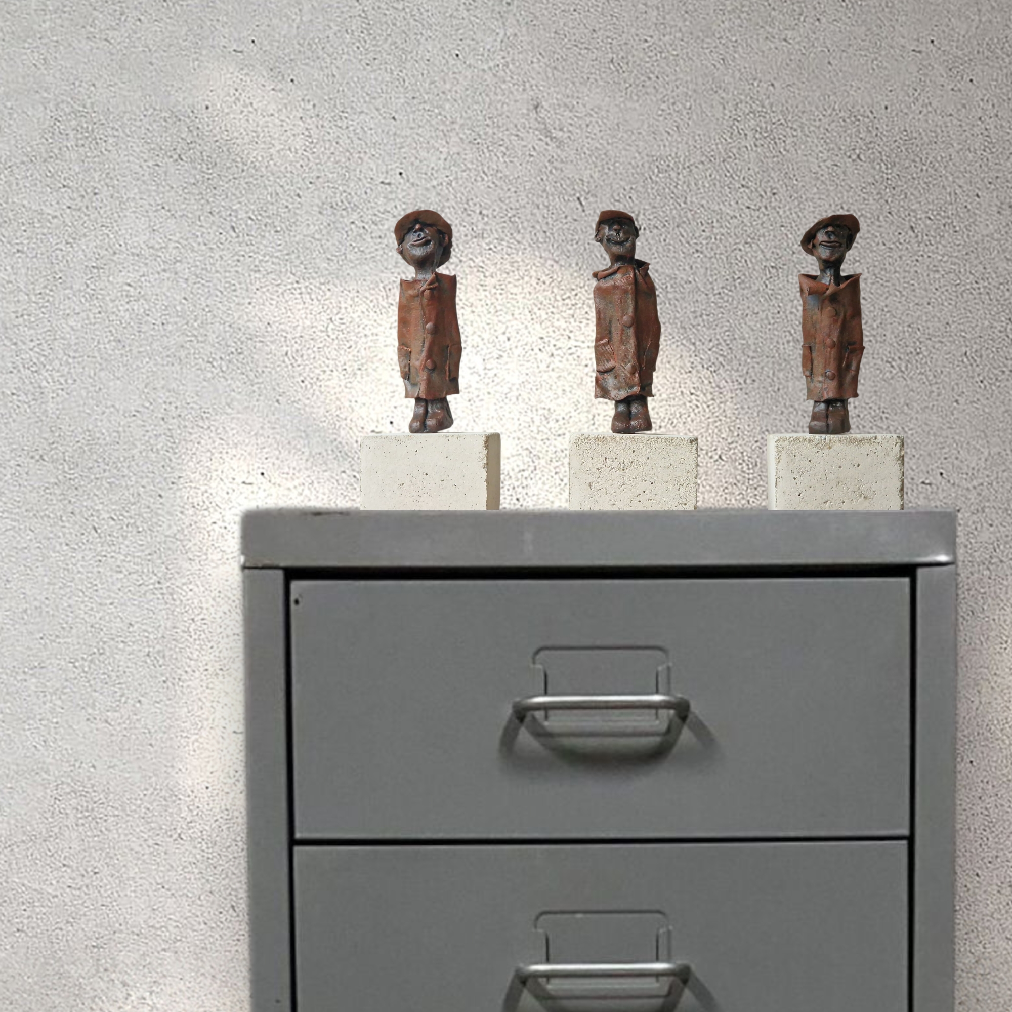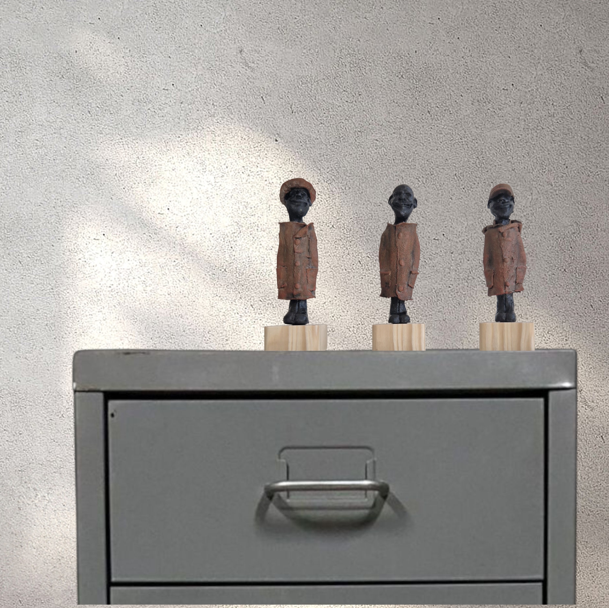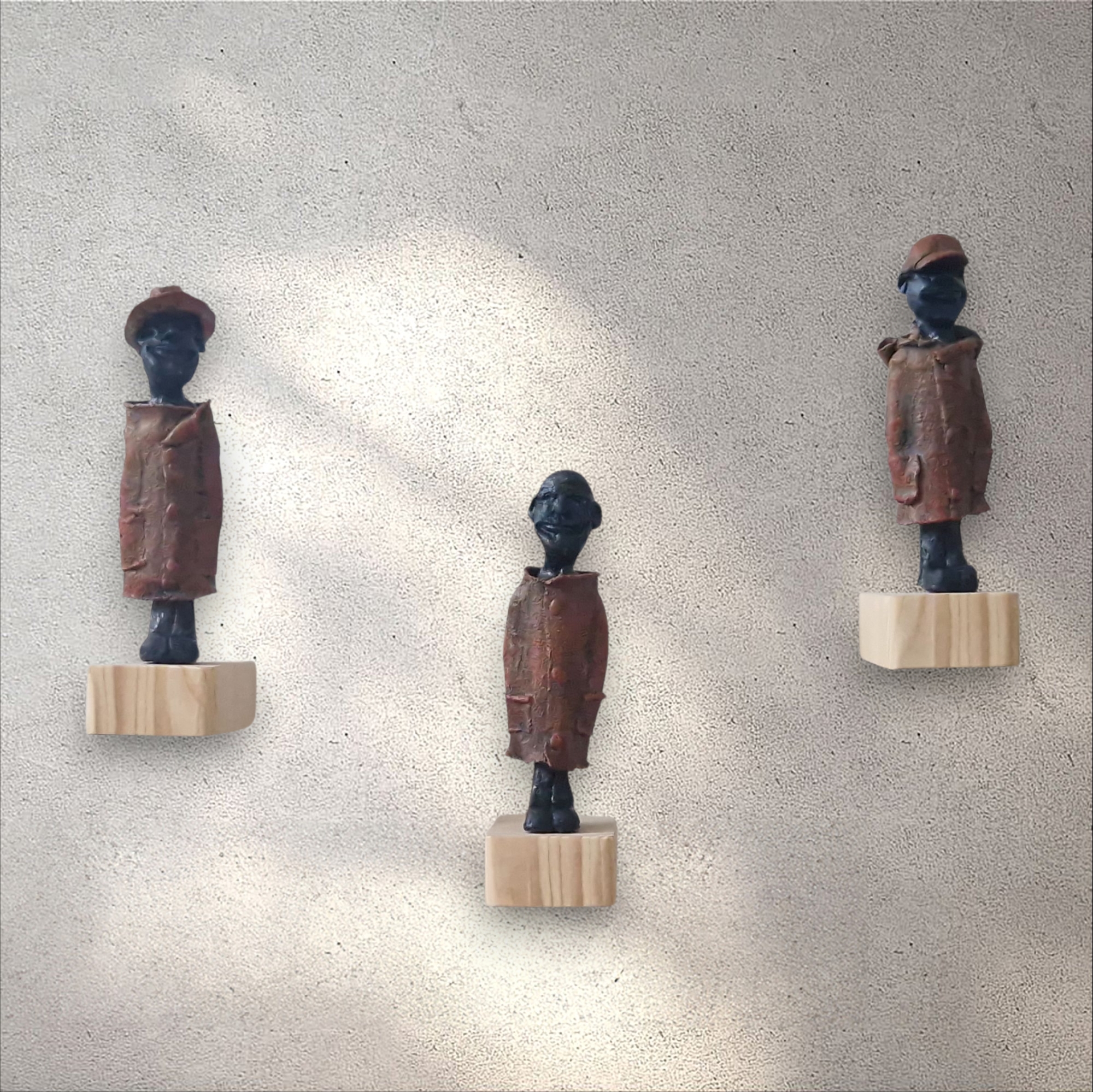 Burgerwacht Burgerwacht bestaat uit 3 figuren op houten of betonblokjes. De figuren zijn gemaakt van klei en textielverharder. De houten blokjes kunnen zowel aan de muur (blind) bevestigd worden als neergezet worden.